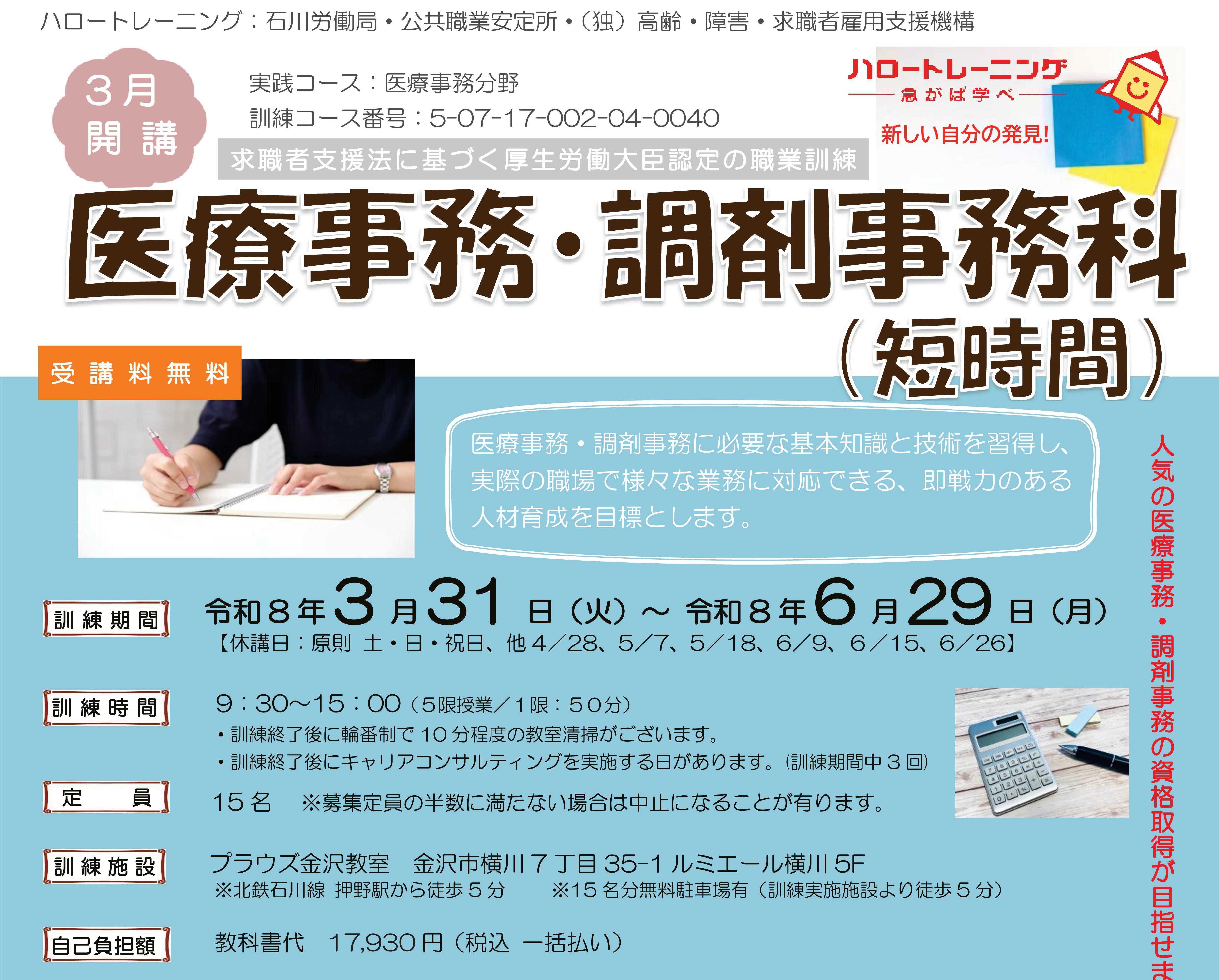 医療事務・調剤事務科(短時間) ~受講生募集のご案内~ プラウズ金沢教室では医療事務・調剤事務科(短時間)の求職者支援訓練を開講予定です。医療事務と調剤事務の学習を中心に学び、資格取得後の就職を目標としています。随時施設…
