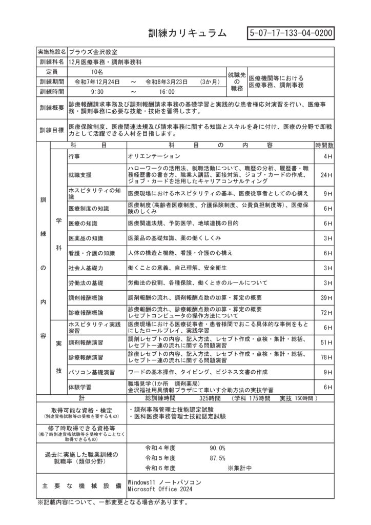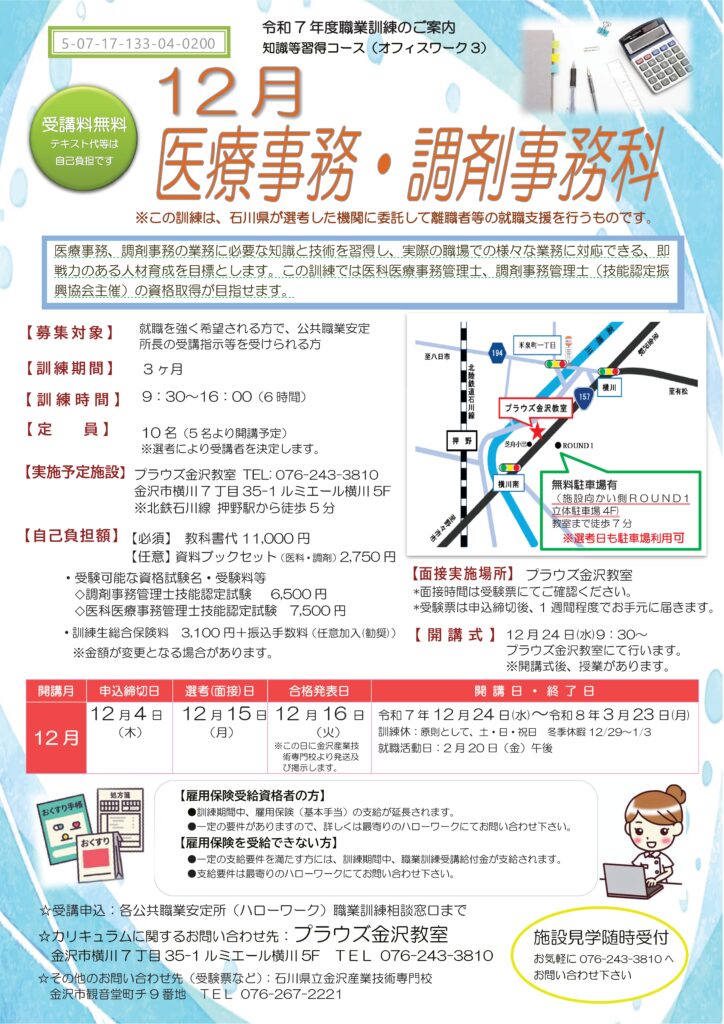 プラウズ金沢教室では12月医療事務・調剤事務科の公共職業訓練を開講予定です。