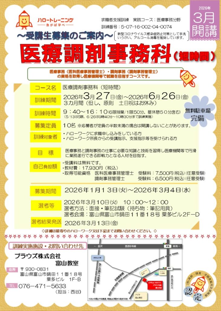 プラウズ富山教室では医療調剤事務科(短時間)の求職者支援訓練を開講予定です。